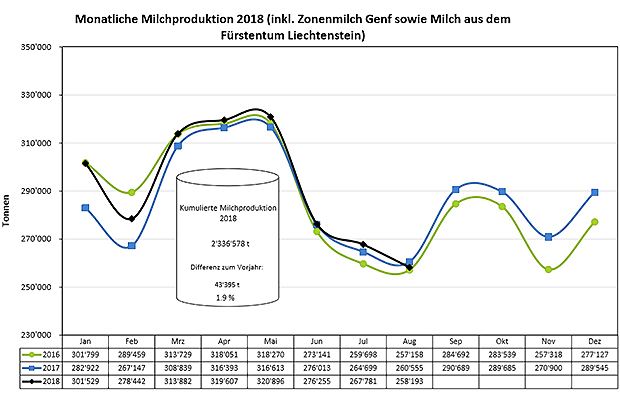 Der heisse, trockene und futterarme Sommer hat sich also auch in der Milchproduktion niedergeschlagen. Im August 2018 wurde insgesamt 258'193 Tonnen Milch angeliefert. Das sind 2'362 Tonnen oder 0.9 Prozent weniger als im Vorjahresmonat. Die kumulierte Milchproduktion der ersten acht Monate 2018 liegt bei 2'336’587 Tonnen. Das sind 1.9 Prozent oder 43’395 Tonnen mehr als 2017. 2016 lag die Produktion 5282 Tonnen oder 0.3 Prozent unter dem kumulierten Wert von 2016-