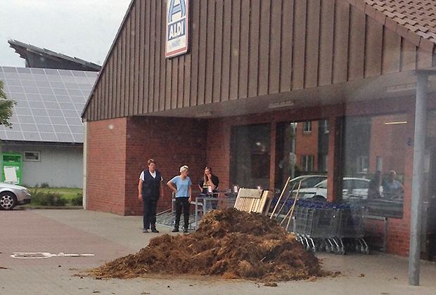 Etwa 150 ostfriesische Milchviehhalter protestierten vergangene Woche nach Mitteilung des Landesverbandes Niedersachsen und Bremen der Arbeitsgemeinschaft bäuerliche Landwirtschaft (AbL) mit 80 Treckern vor der Aldi-Filiale in Hesel. Bei der hauptsächlich vom Bundesverband Deutscher Milchviehhalter (BDM) organisierten Aktion wurde gegen die Rolle von Discountern, Molkereikonzernen und Politik beim ruinösen Verfall der Milchpreise demonstriert und dabei laut AbL teilweise die Anlieferung von Ware behindert.