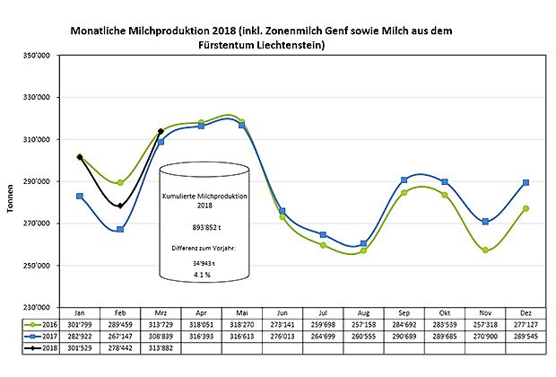 Die kumulierte Milchproduktion der ersten drei Monate 2018 liegt bei 893'852 Tonnen. Das sind 4.1 Prozent oder 34'943 Tonnen mehr als 2017. In den drei Monaten 2016 wurden 1.2 Prozent oder 11'135 Tonnen mehr Milch eingeliefert als 2018. Insgesamt wurden 904'987 Tonnen Milch produziert.