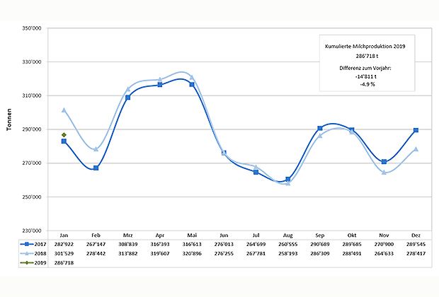 Gemäss der Monatsstatistik von der Treuhand TSM wurden im Januar 2019 286'718 Tonnen Milch produziert, das sind 14’811 Tonnen oder 4.9 Prozent weniger als im Vorjahresmonat. Im Januar 2017 lagen hingegen die Einlieferungen mit 282'922 Tonnen rund 3'800 Tonnen tiefer als im Januar 2019.