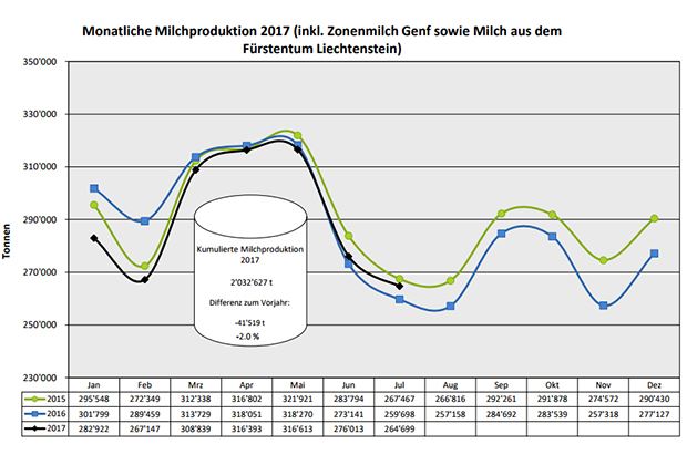 Die kumulierte Produktion der ersten sieben Monate 2017 liegt immer noch um 2 Prozent oder 41'519 Tonnen unter dem Vorjahreswert. Insgesamt wurden bis Ende Juli 2'074’146 Tonnen Milch produziert. Im Vergleich zu 2015 ist die Produktion in diesem Jahr um 1.8 Prozent oder 37'600 Tonnen tiefer.