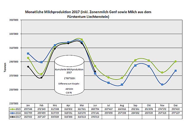 Erstmals seit über 12 Monaten hat die Milchproduktion in der Schweiz wieder zugenommen. Im Juni 2017 wurde im Vergleich zum Vorjahresmonat um 1.1 Prozent mehr gemolken. Die kumulierte Produktion 2017 liegt aber immer noch hinter dem Vorjahreswert.