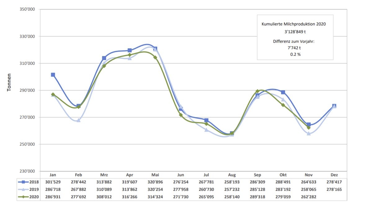 Und die Aussagen der Organisationen wird gestützt durch die Statistik. Die kumulierte Milchproduktion von Januar bis November 2020 betrug 3‘128‘849 Tonnen. Sie lag damit um 7‘742 Tonnen, das sind lediglich 0.2 Prozent mehr als in der Vorjahresperiode. Im November 2020 wurden 262‘282 Tonnen Milch. Gegenüber dem Vorjahresmonat entspricht dies einer Zunahme von 4‘217 Tonnen oder plus 1.6 Prozent.