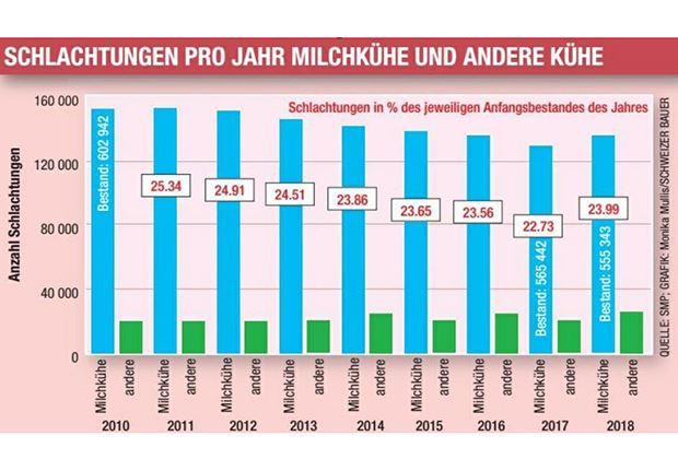 Die Schweizer Kühe werden immer älter. Das wird deutlich, wenn man sich ansieht, wie viele Milchkühe vom Anfangsbestand des Jahres geschlachtet wurden. Diese Zahl sinkt laufend (siehe Grafik). Waren es 2011 noch über 25 Prozent, so fiel die Zahl auf unter 24 Prozent im Jahr 2017.