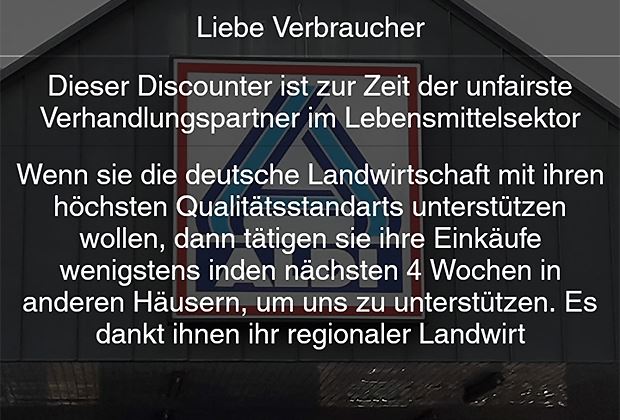 Ein aggressive Stimmungsmache sei inakzeptabel und keine Grundlage für Gespräche. So hätten einzelne Bauern zu Straf- und Gewalttaten gegen Filialen und Mitarbeiter aufgerufen, schreibt Aldi.