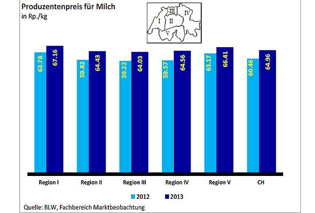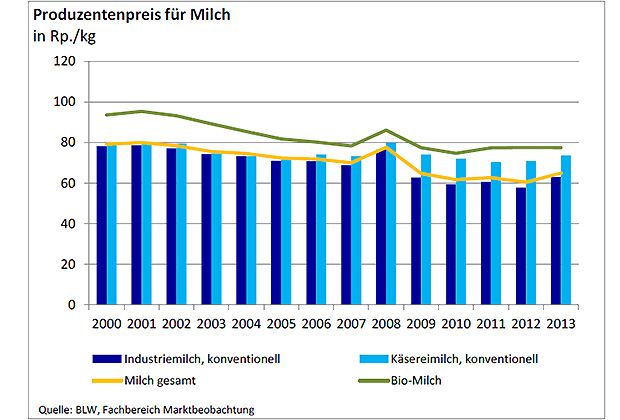 Die Milchproduzenten in der Schweiz haben im vergangenen Jahr wieder mehr Geld für ihre Milch erhalten. Nachdem der Produzentenpreis im Jahr 2012 auf den tiefsten Stand seit Beginn der Preisbeobachtung im Jahr 1999 gefallen war, legte er 2013 deutlich um 4,5 Rappen zu.