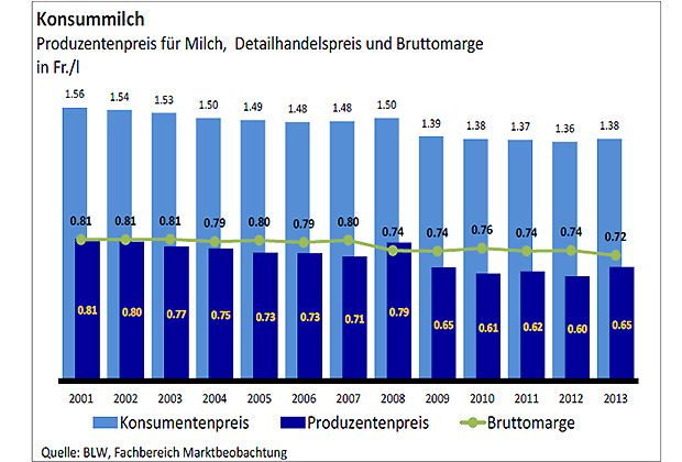 Die Aufwärtstendenz beim Milchpreis ist laut BLW unter anderem auf den Rückgang der Milchproduktion, die grosse Nachfrage und die gute internationale Marktlage zurückzuführen. Auch die Konsumenten bekamen die Preiserhöhung zu spüren. Erstmals seit vier Jahren stieg der Detailhandelspreis für Konsummilch - verglichen mit 2012 um 2 Rappen auf 138 Rappen pro Liter. Da der Produzentenpreis im Vergleich zum Konsumentenpreis stärker anstieg, sank die Bruttomarge um 3 Rappen pro Liter.