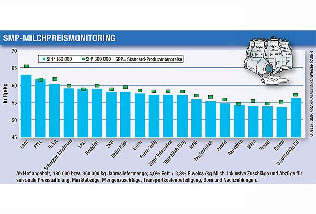 Insgesamt zeigt die Auswertung der SMP ein gewisses Ost-West-Gefälle, obschon es hüben wie drüben Ausreisser gibt. Bemerkenswert ist zudem, dass zwischen den höchsten Milchpreisen bei Lanz und den tiefsten (Cremo) eine Differenz von 9,2 Rp./kg (180'000kg Milchmenge) beziehungsweise 10,49 Rp./kg (360'000kg Jahresmilchmenge) besteht. Der Schweizer Durchschnittspreis betrug im untersuchten Zeitraum 56,17 Rp./kg (180'000kg Milchmenge) bzw. 57,20 Rp./kg (360'000 kg Milchmenge).