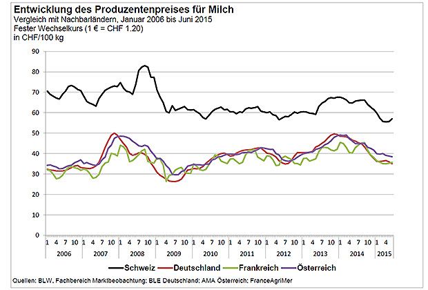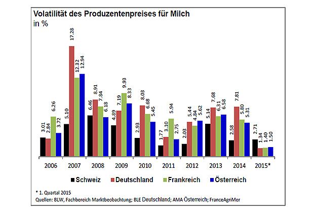 Insgesamt fällt die Volatilität (Grafik 3) des Milchpreises in der Schweiz schwächer aus als in den benachbarten EU-Staaten. Während die Schweiz zwischen 2006 und 2015 eine nicht annualisierte Volatilität (Abweichung der Monatspreise vom Jahresmittel) von 9 Prozent aufweist, liegt diese in Deutschland bei 15, in Österreich und Frankreich bei 12 Prozent.