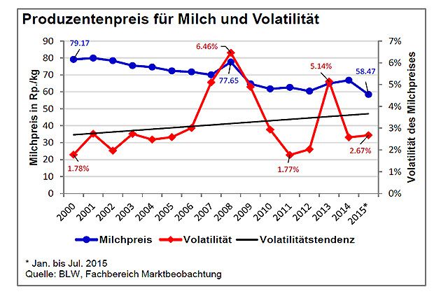 Zwischen Januar 2000 und Juli 2015 sank der Milchpreis um 26 Prozent (20 Rp./kg) auf 59,90 Rp./kg. Seit 2007 der Käsemarkt liberalisiert wurde, sind auch die globalen Schwankungen von Angebot und Nachfrage in der Schweiz stärker spürbar. Der Milchmarkt ist damit vermehrt starken Volatilitätsschwankungen ausgesetzt. Die höchste Volatilität (Ausschlag und Häufigkeit von Schwankungen des Milchpreises in einem gegebenem Zeitraum -> Grafik1: Abweichung der Monatspreise vom Jahresmittel) wurde im Jahr 2008 gemessen. Anschliessend bildete sich diese zurück. Auch im 2013 wurde wieder eine erhöhte Volatilität beobachtet.