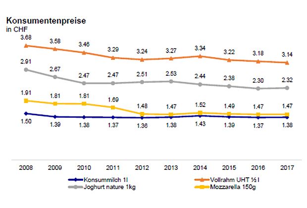Im jüngsten Marktbericht Milch des BLW wurde die Entwicklung der Konsumentenpreise von Milchprodukten zwischen 2008 und 2017 untersucht. Dabei wurden Preisrückgänge zwischen 8 bis 23 Prozent beobachtet.