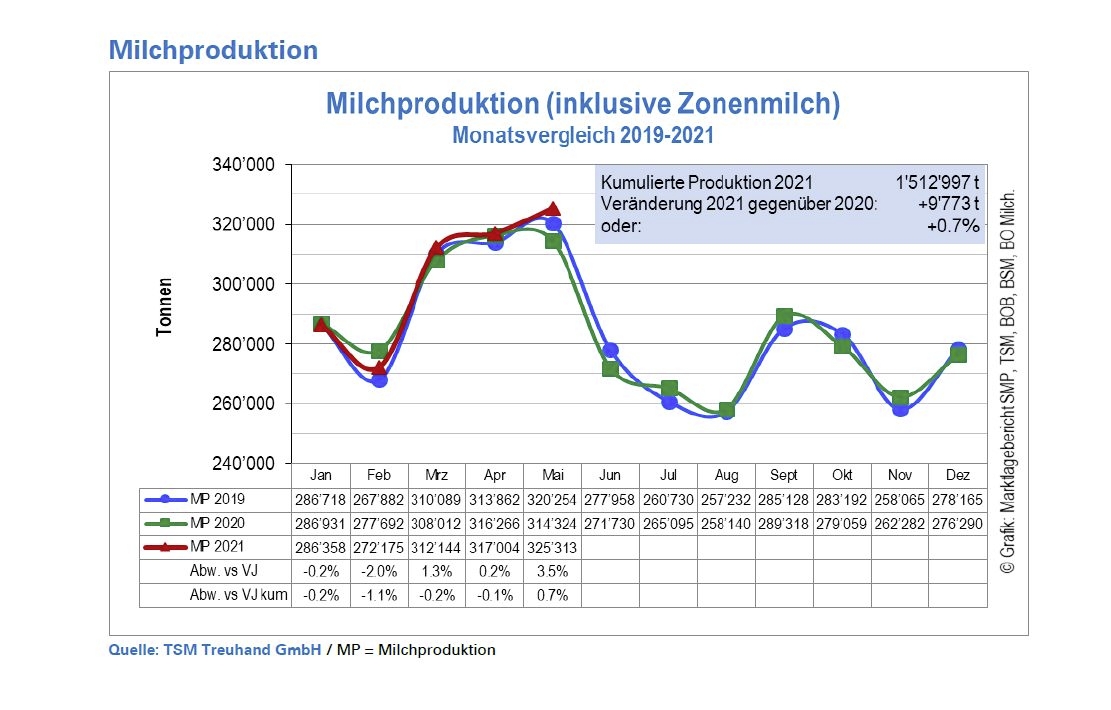 Auch bei der kumulierten Milchproduktion hat sich im Mai ein leichtes Plus eingestellt. Die kumulierte Produktion von Januar bis Mai 2021 betrug 1‘512‘997 Tonnen, das waren 9‘773 Tonnen oder 0.7 Prozent mehr als in der Vorjahresperiode. Um das Schaltjahr korrigiert, liegt die Milchproduktion der ersten fünf Monate auf der Vorjahreshöhe.