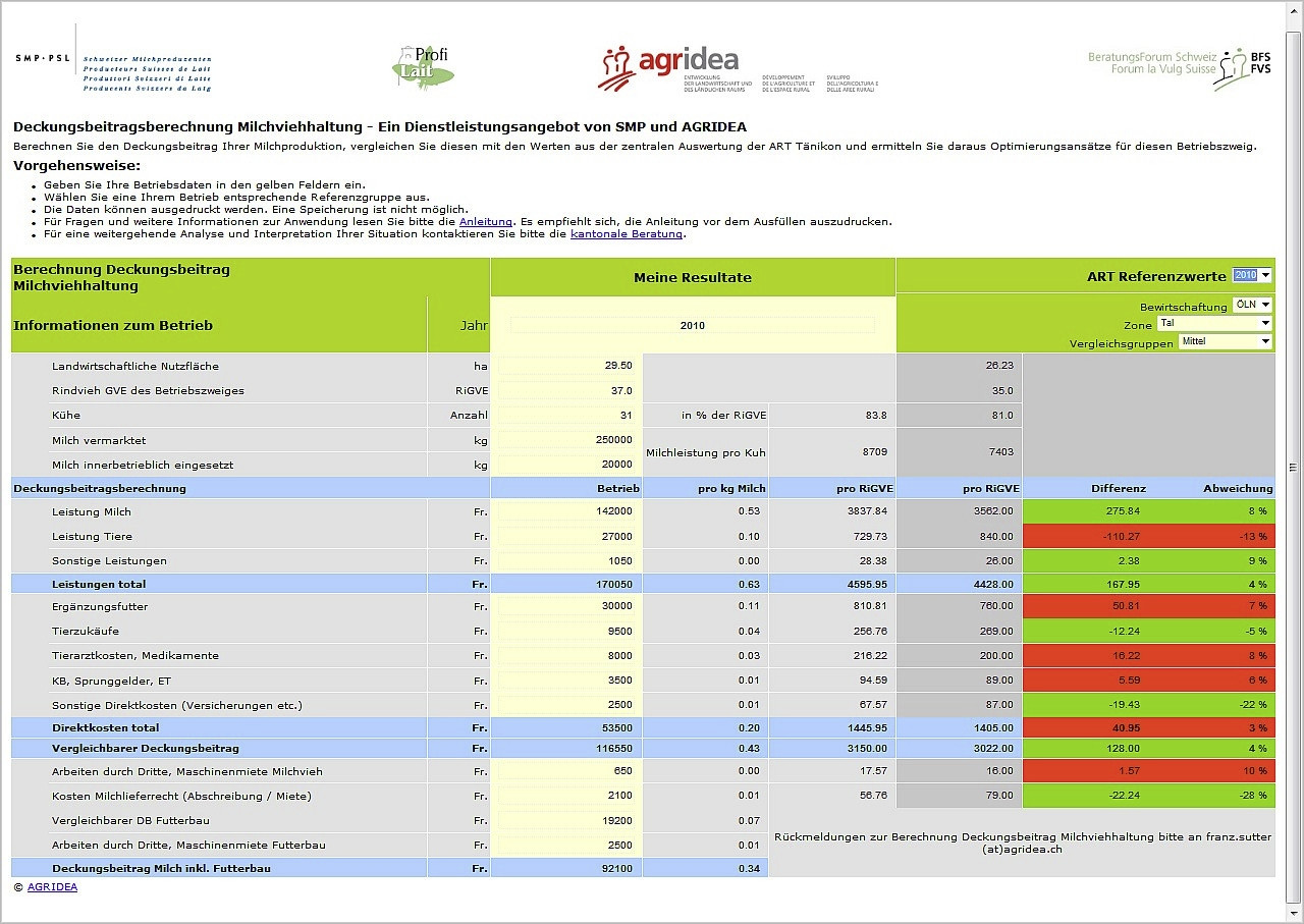 Zunächst werden im Kostenrechner allgemeine Angaben zum Betrieb abgefragt, danach die Werte für die Ausgaben wie Ergänzungsfutter oder Tierzukäufe. Anschliessend ergänzt man die Maske mit dem Erlös für Milch, für Tiere und für Sonstiges. Nun können das aktuelle Vergleichsjahr und die dem Betrieb entsprechende Vergleichsgruppe ausgewählt werden. Erscheint eine Position in Grün, schneidet man besser ab, in Rot, dann schneidet man schlechter ab als die ausgewählte Vergleichsgruppe.