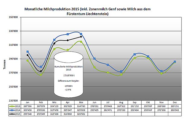 Die kumulierte Milchproduktion in den ersten fünf Monaten dieses Jahres liegt um 1,9 Prozent oder 29‘069 Tonnen tiefer. Bis Ende Mai 2015 wurden gemäss TSM 1‘518‘956 Tonnen Milch produziert. In der Vorjahresperiode waren es 1‘548‘025 Tonnen. Die ersten Prognosen für Juni 2015 deuten auf ein weiteres Minus hin. Dies fällt aber mit -0,7 Prozent deutlich tiefer aus als in den Vormonaten. Für Juli wird ebenfalls mit abnehmenden Einlieferungen gerechnet.