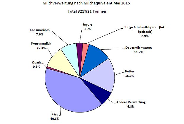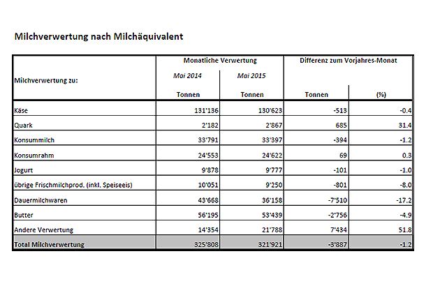 Bei der Milchverwertung (nach Milchäquivalent) im Mai 2015 ist vor allem der deutliche Rückgang bei den Dauermilchwaren auffällig. Die Produktion lag bei 36‘158 Tonnen. Dass sind 7‘510 Tonnen oder 17,2 Prozent weniger als im Mai 2014. Auch die Butterproduktion war im Mai rückläufig. Diese reduzierte sich um 4,9 Prozent (2‘756 t) auf 53‘439 Tonnen. Zugenommen hat im Mai die Herstellung von Quark (+31,4% oder 685 Tonnen) auf 2‘867 Tonnen und das Segment „andere Verwertung“ mit einem Plus von 52 Prozent (7‘434 Tonnen) auf 21‘788 Tonnen.
