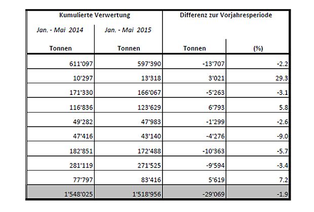 Werden die ersten fünf Monate des Jahres 2015 betrachtet, fällt vor allem das Minus bei „übrige Frischmilchprodukte (inkl. Speiseeis)“ von 9 Prozent (4‘276 t), bei den Dauermilchwaren (-5,7% oder 10‘363t), der Konsummilch (-3,1% oder 5‘263t) sowie bei der Butter (-3,4% oder 9‘594t) im Vergleich zur Vorjahresperiode ins Gewicht. Eine zunehmende Verwertung in den ersten fünf Monaten wurde beim Konsumrahm (+6‘793t oder 5,8%), beim Segment „andere Verwertung“ (+5‘619t oder 7,2%) sowie beim Quark (+3‘021t oder 29,3%) beobachtet.