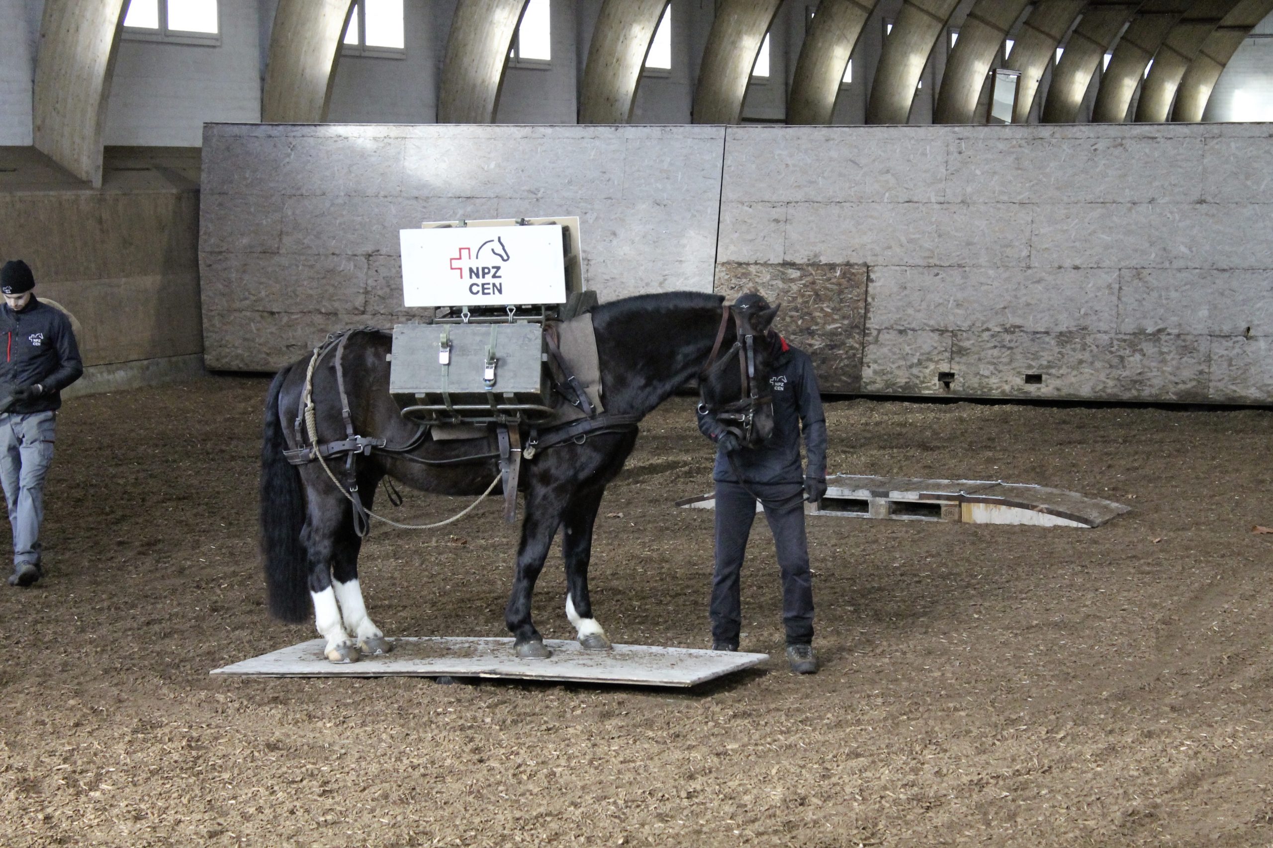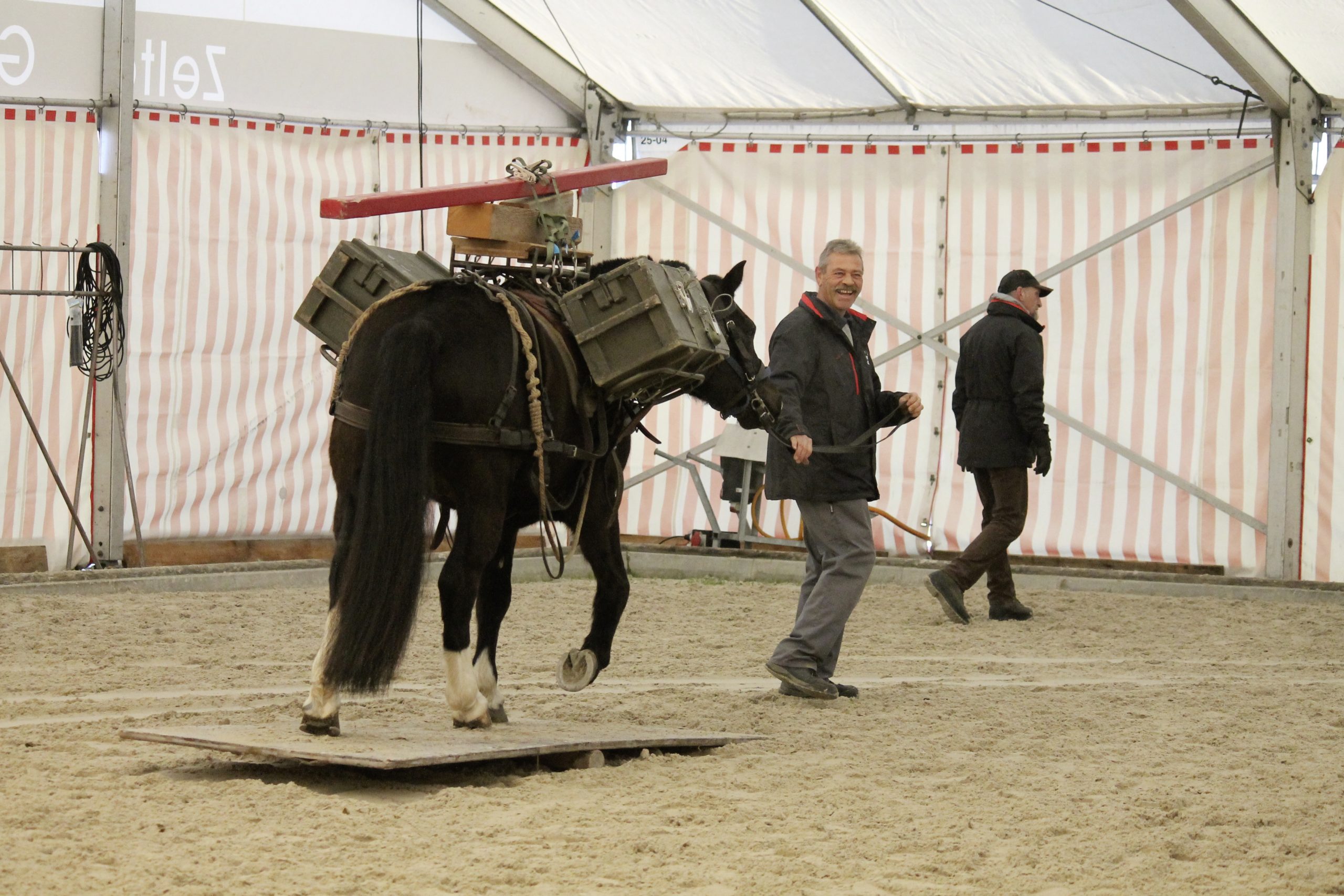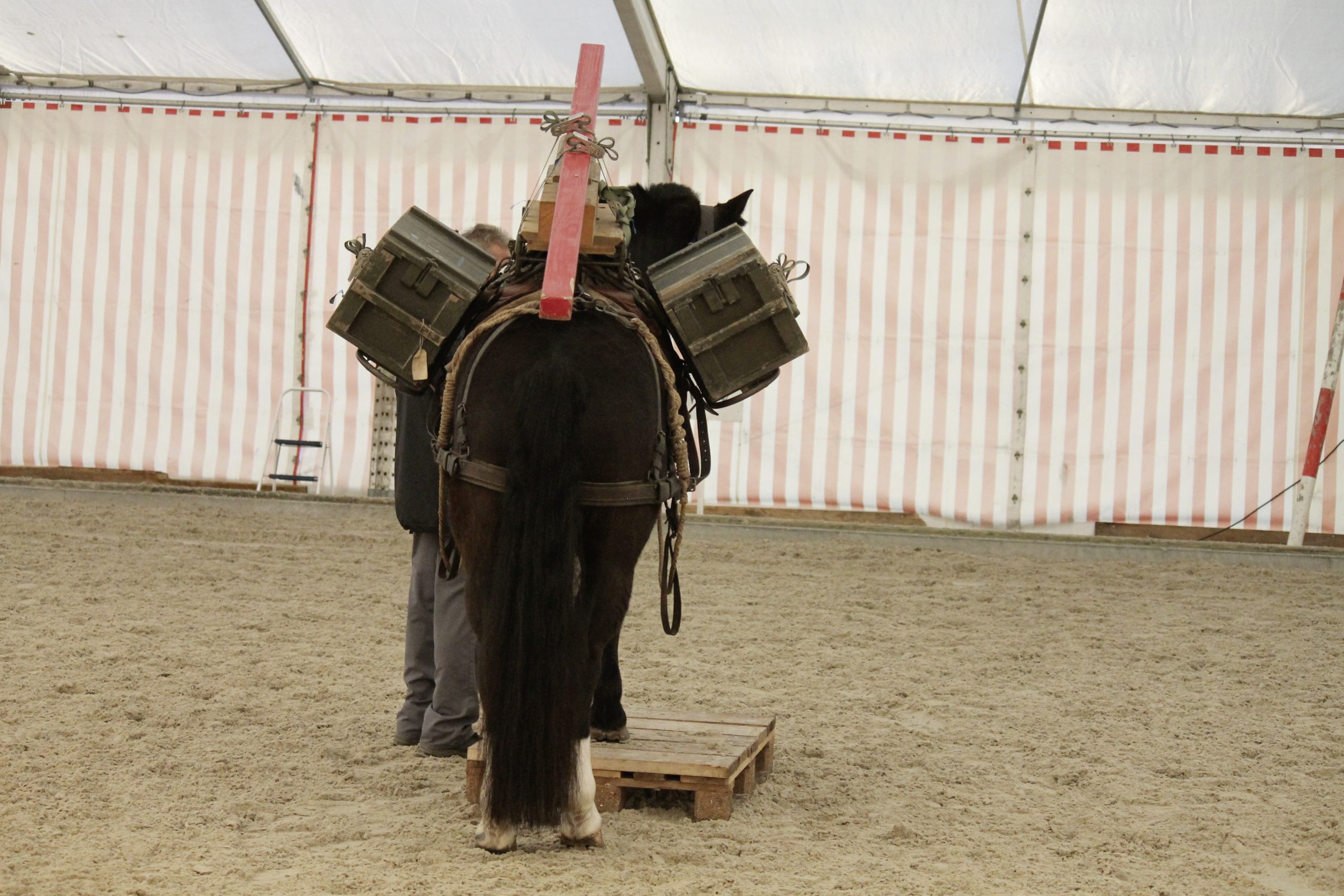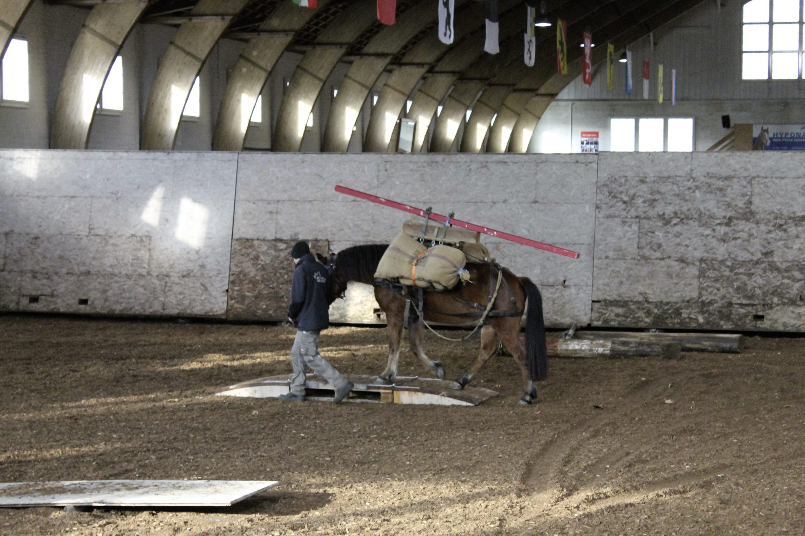 Die Lasten bewegen sich beim Überqueren der Hindernisse mehr, und das Pferd muss dabei trotzdem ruhig und konzentriert bleiben und die Lasten ausbalancieren. Die Tiere müssen beispielweise auch einfach einmal einen Moment auf dem Podest verbringen und somit eine ungewohnte Position mit der Last einnehmen.