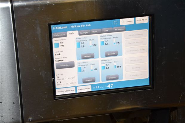 Die Daten, die sie aufs Handy erhalten, können Kaufmanns auch direkt am VMS-Touchscreen oder im Stallbüro am Computer abrufen. Dort reicht ein Fingertipp, um Zellzahl, Tagesleistung, Milchfluss, Viertelgemelk, letzte Melkung usw. anzuzeigen. «Die Melkdauer pro Kuh können wir nicht beeinflussen», ergänzt Urs Schmid, «der Trend beim VMS geht deshalb eindeutig in Richtung modernerer, schnellerer Software und neuer Managementprogramme. Dank dem Herdnavigator werden auch die Ketonkörper oder der Progesteronspiegel in der Milch gemessen.»
