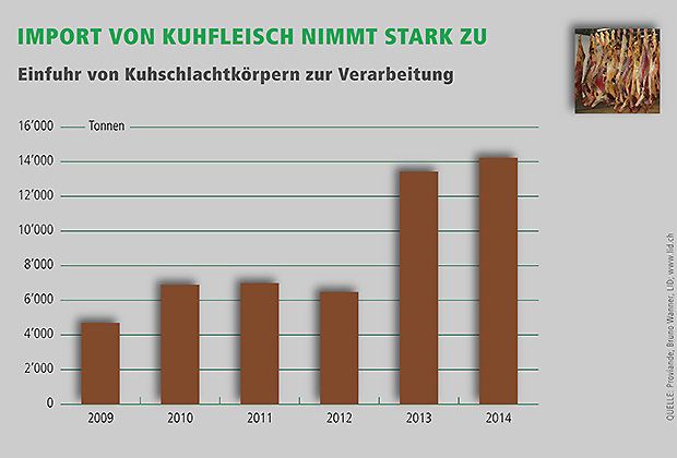 14‘200 Tonnen waren es im letzten Jahr, das sind Schlachthälften von rund 45‘000 Kühen. Damit stammte über 25 Prozent des in der Schweiz verarbeiteten Kuhfleisches aus dem Ausland. Der Grund für die zunehmenden Einfuhren: Der sinkende Kuhbestand vermag die anhaltend hohe Nachfrage bei weitem nicht zu decken.