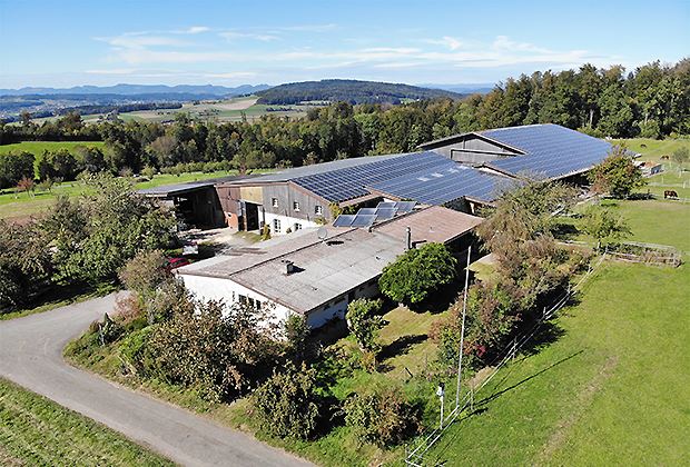 Das grosse Ziel des Biolandwirts: Den Betrieb unabhängig von externen Energieträgern und vor allem Erdöl zu machen. Die Dächer der Reithalle und der Ställe, die 2010 uns 2012 gebaut wurden, sind von Fotovoltaikanlagen ausgerüstet. Pro Jahr werden damit ungefähr 360'000 kWh elektrische Energie produziert, womit über 120 Haushalte versorgt werden können. Die Heisswasserversorgung wird mit Sonnenenergie oder im Winter durch das Heizen mit Holz sichergestellt.