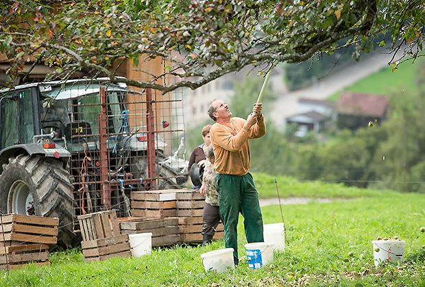 Baumbestandene Wiesen prägen die sonnigen Appenzeller Hänge hoch über dem Rheintal. Die hohe Wertschöpfung des Trendgetränks Bschorle, ein Mischung von Bier und Saft, ermöglicht den Erhalt der Obstbäume.