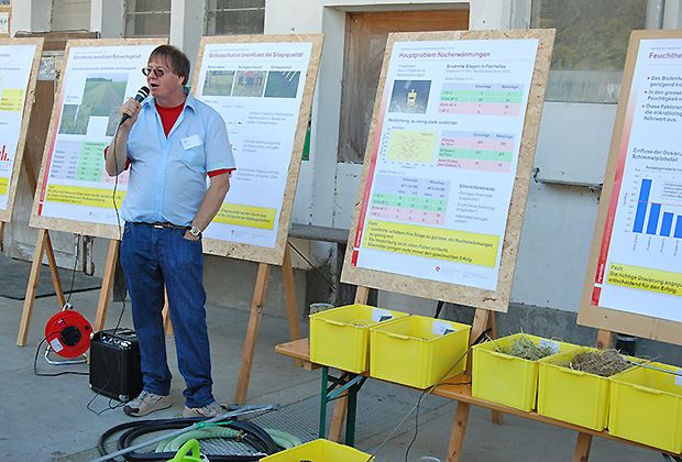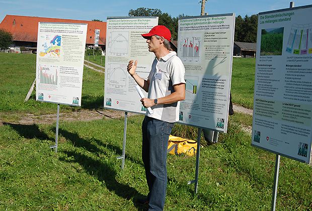 Mischung oder Reinbestand? Um diese Frage ging es beim Posten von Andreas Lüscher von Agroscope. Klee-Gras-Mischungen sind in der Schweiz seit langem Standard, während in Europa zum Teil immer noch Gras-Reinbestände angesät werden. Ein europaweites Versuchsnetz hat nun gezeigt: Mischungen bringen gegenüber Reinbeständen enorme Vorteile.