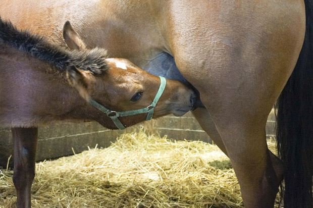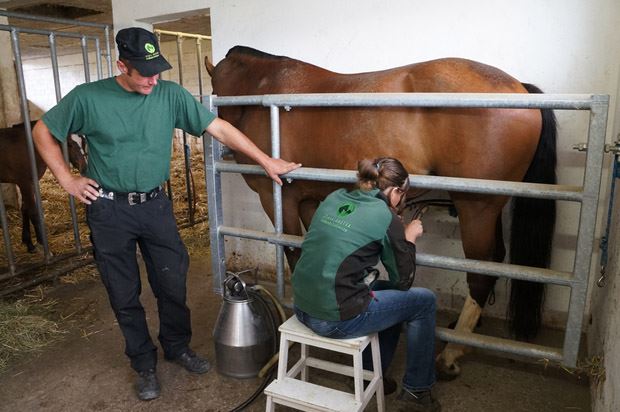 Innerhalb von zwei bis drei Stunden melken sie die Stuten, um Mutter und Tier nicht allzu lange zu trennen. Ist das Melken vorbei, lassen sie die Fohlen zu ihren Müttern. Sofort beginnen die jungen Tiere zu trinken, denn Milch ist immer noch genügend vorhanden. "Einem Fohlen stehen von ihrer Mutter pro Tag 20 bis 30 Liter Milch zur Verfügung. Davon melken wir einmal pro Tag maximal 1,5 Liter Milch. Mehr wäre auch nicht möglich, denn die Stute hat kein grosses Euter und produziert die Milch fortlaufend neu. So bleibt dem Fohlen genügend Nahrung.", sagt Manuela Kuster.