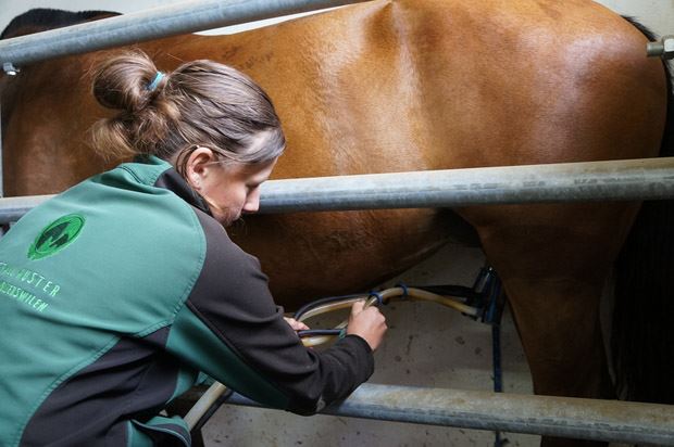 Die Pferdeliebhaberin setzt die beiden Melkbecher an die Zitzen der Stute an. Das alles dauert wenige Minuten, verläuft ruhig und ohne Probleme. "Die Stuten sind sich an uns gewöhnt", sagt Kuster. "Sie wissen, dass wir sorgsam mit ihnen umgehen und dass ihnen nichts passiert." Kommt dazu, dass sie ihre Fohlen immer sehen können.