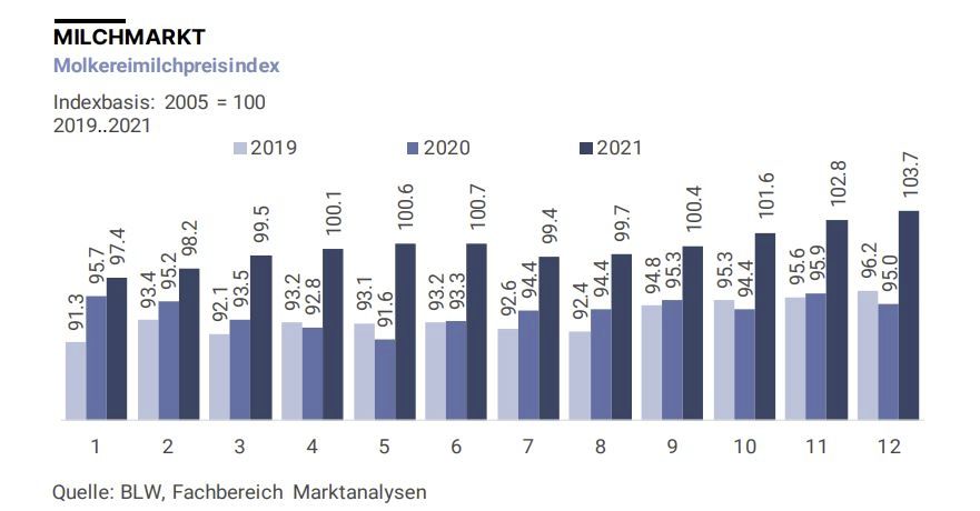 Wichtig für die Milchproduzenten und die Verarbeitet ist der Molkereimilchpreisindex. Dieser bildet die Entwicklung der Preise von Molkereimilchprodukten für den Detailhandel und die Industrie sowie der Produzentenpreise für Milch in den umliegenden Ländern ab. Der Index ist also eine vergangenheitsbezogene Grösse.