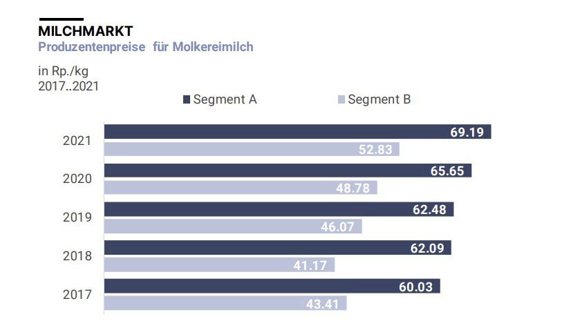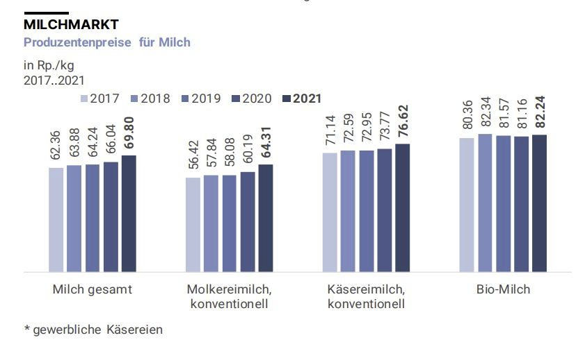 Es gab jedoch je nach Segment unterschiedliche Preissteigerungen. Der Produzentenpreis für konventionelle Milch erhöhte sich um 5,8 Prozent auf 68.92 Rp./kg. Biomilchproduzenten hingegen konnten für ihre Milch 82,24 Rp./kg lösen, 1,3 Prozent mehr als 2020. Bei der konventionellen Milch nahm 2021 der Produzentenpreis für Molkereimilch stärker zu (+6,9 % auf 64.31 Rp./kg) als für Käsereimilch (+3,9 % auf 76.62 Rp./kg). Molkereimilch wird hauptsächlich zu Konsummilch, Butter, Milchpulver, Konsumrahm, Jogurt und Industriekäse (z.B. Mozzarella) verarbeitet.