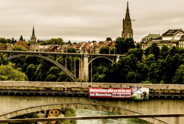 Auf der Berner Lorrainebrücke hängt ein übergrosses, 16-Kilogramm-schweres Transparent mit der Aufschrift: «Mutterliebe gibt es nicht nur bei Menschen. Lebe vegan.» Neben dem Text ist auf dem Plakat eine Kuh abgebildet, die sich liebevoll um ihr Kalb kümmert. Wer mit dem Zuge nach Bern reist, kann es kaum übersehen.