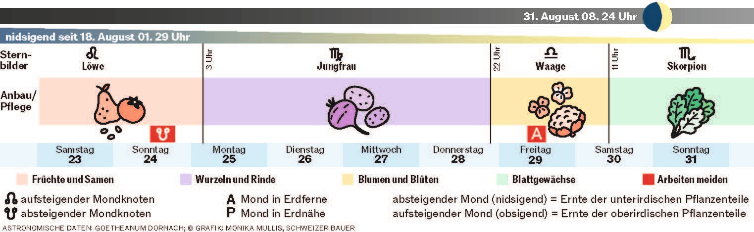 Der Kalender, dessen Daten vom Goetheanum zur Verfügung gestellt werden, zeigt die Mondphasen und besonders geeignete Pflanz-, Pflege- und Erntezeiten. Ersichtlich sind die auf- und absteigende Mondbahn («obsigänd», «nidsigänd») die Blatt-, Blüten-, Frucht- und Wurzeltage und ungünstige Knotentage . Fast die ganze nächste Woche eignet sich demnach, um sich um Randen, Rüben oder Kartoffeln zu kümmern.
