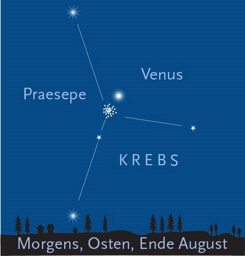 Jupiter steht dabei für die Erkenntnis, und Venus für die Empathie. Jupiter bleibt in den Zwillingen und ist jeden Morgen höher am Himmel zu finden, während Venus am Horizont bleibt und dabei aus den Zwillingen in den Krebs wandert. Was unsichtbar bleibt, ist, dass Venus in den letzten Augusttagen das Zentrum des Krebs erreicht. Dort befindet sich Praesepe, der offene Sternhaufen in der Mitte des Krebssterns.