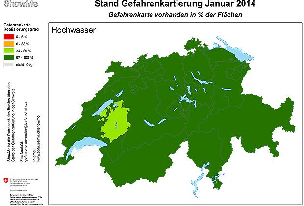 93 Prozent der Gefahrenkarten seien erstellt, liess sich Roberto Loat von der Abteilung Gefahrenprävention des BAFU im Communiqué zitieren. Nur in wenigen Kantonen gibt es noch Lücken. Bis 2016 sollen alle Gebiete erfasst sein. Die Karten können mehrheitlich im Internet angeschaut werden.
