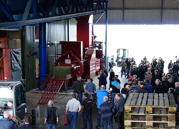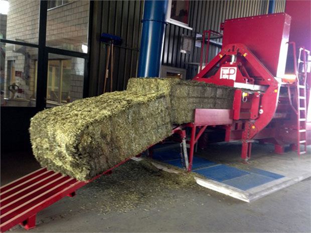 Die Ballenstrasse funktioniert so: Das getrocknete Grünfutter wird nach der Trocknung auf einem Bandkühler gekühlt und anschliessend in der neuen Presse zu Quaderballen von rund 350 kg gepresst. Die Ballen sind Garngebunden mit fünf Schnüren pro Balle.
