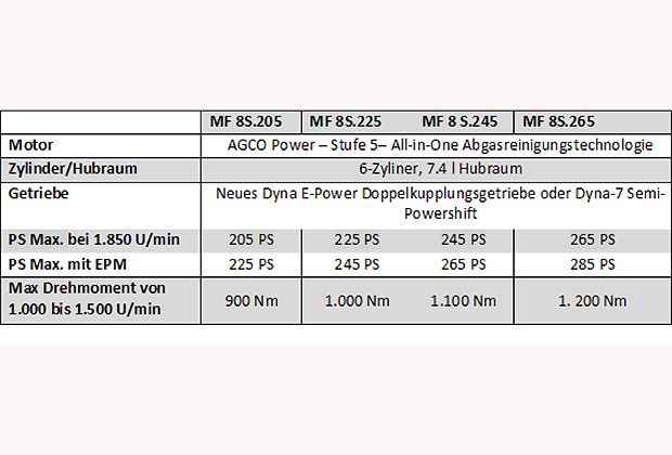 An der Baureihe MF 8S wurde während sieben Jahren gearbeitet. Es gibt vier neue Modelle, die sich alle durch die «Protect-U»-Kabinen-/Motorinstallation und ein Neo-Retro-Design auszeichnen. Aufgebaut auf einem Radstand von 3,05 m, bieten sie maximale Leistung von 205 bis 265 PS sowie zusätzliche 20 PS Boost, aus dem Engine Power Management (EPM).