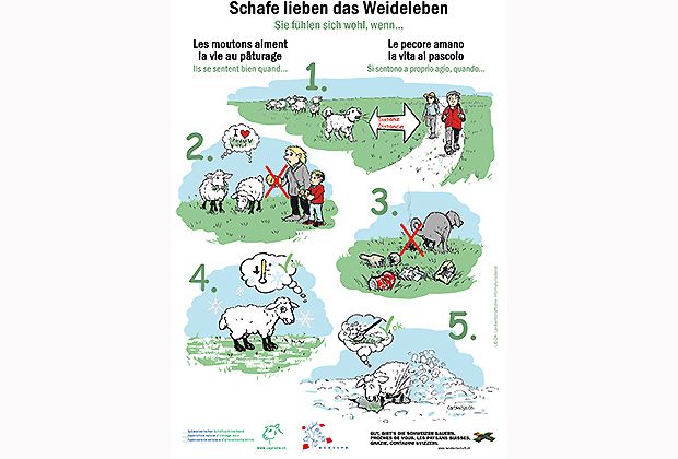Unter dem Titel "Schafe lieben das Weideleben" hat der Landwirtschaftliche Informationsdienst (LID) in Zusammenarbeit mit dem Schweizerischen Schafzuchtverband (SZV) und Beratungs- und Gesundheitsdienst für Kleinwiederkäuer (BGK) eine Feldrandtafel erstellt. Zielpublikum sind Spaziergänger, Wanderer, Radfahrer und Passanten, die mit dieser Tafel in fünf Bildern mit wenig Text in 3 Sprachen auf die Bedürfnisse der Schafe hingewiesen werden. Die wichtigsten Aussagen sind: