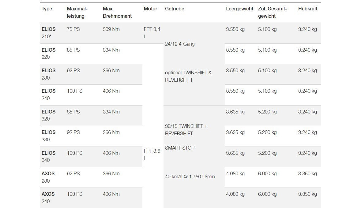 Je nach Modell beträgt das maximale Drehmoment zwischen 334 und 406 Nm. Dabei steht das volle Motordrehmoment über einen weiten Drehzahlbereich zur Verfügung. Unter der Haube des Elios 210 arbeitet das 3,4 l grosse Modell mit 1’600 bar Einspritzdruck, Ladeluftkühler und Viscolüfter, welches 75 PS und bis zu 309 Nm erreicht.