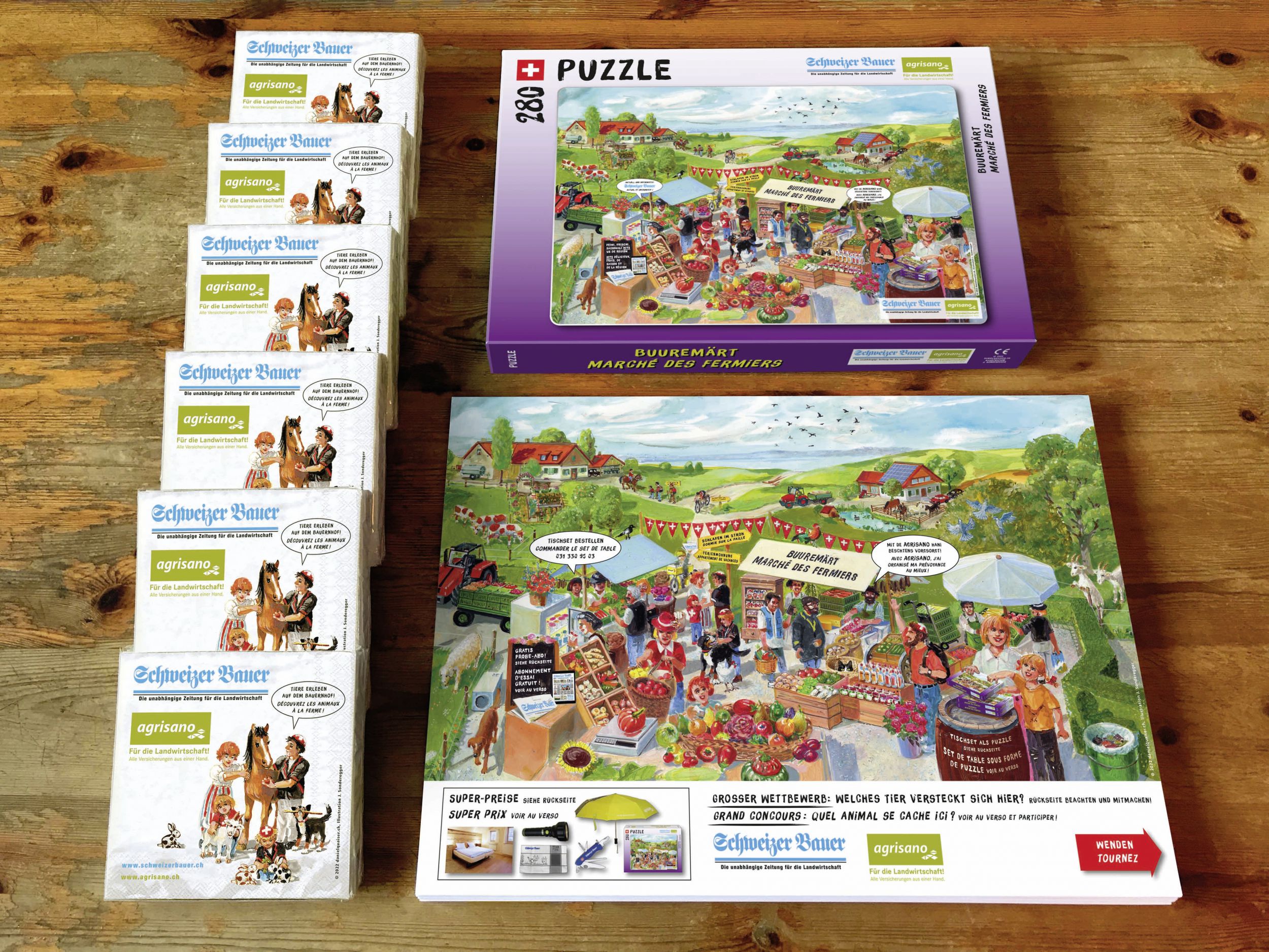 Die liebevoll gemalte Illustration des Tischsets zeigt das Leben auf einem Bauernmarkt. Die Servietten ziert das Motiv einer Bauernfamilie mit Hoftieren. Der lustige Suchbild-Wettbewerb auf dem Tischset lädt Gross und Klein zum Mitmachen ein: Welches Tier versteckt sich hier? Ein toller Spass, bei dem zahlreiche attraktive Preise der beiden Partner Schweizer Bauer und Agrisano sowie von Agrotourismus Schweiz gewonnen werden können. Die von Jahr zu Jahr steigende Anzahl der Teilnehmer am Wettbewerb zeigt, dass er bei allen Altersgruppen sehr gut ankommt.
