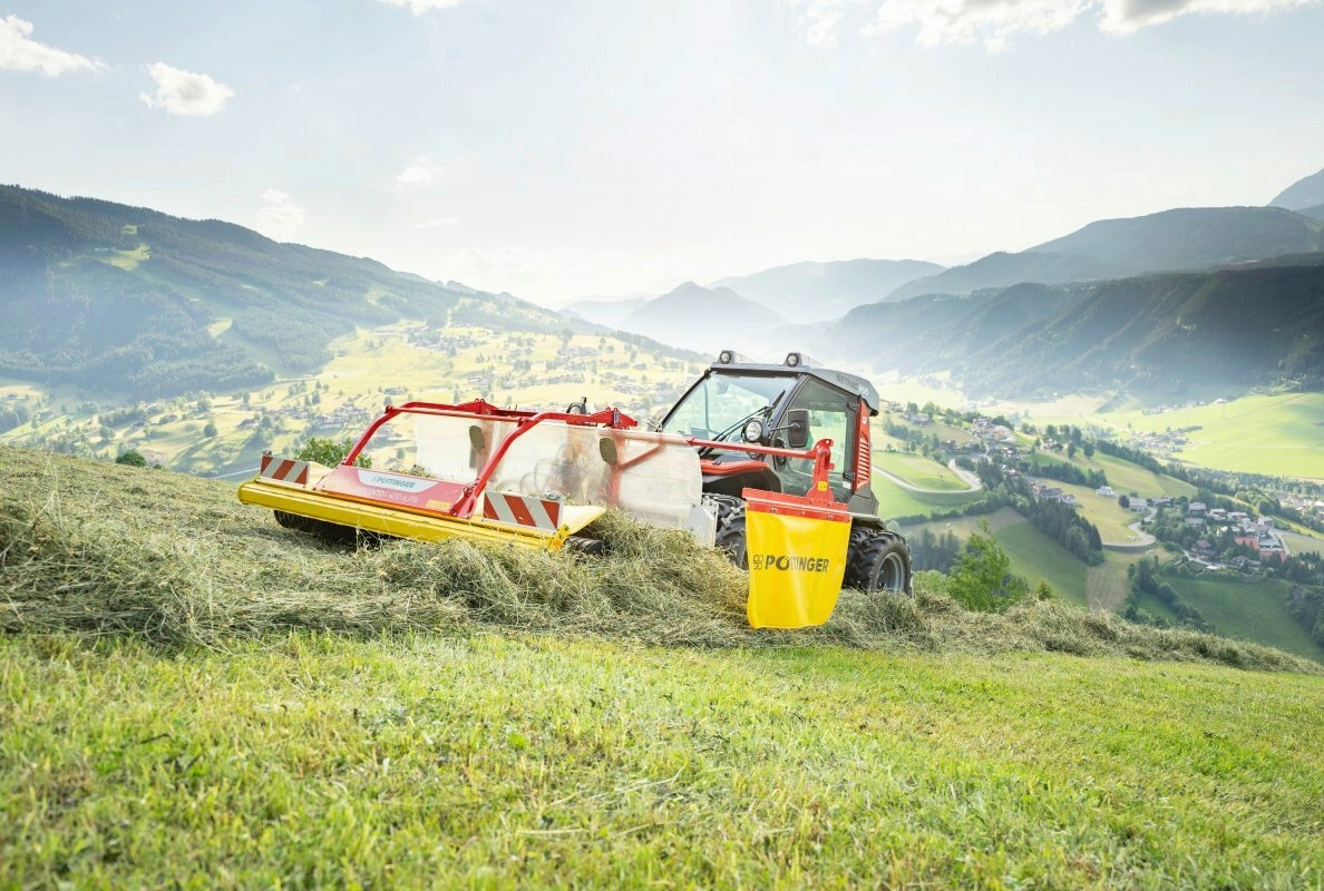 Der alpine Frontbandschwader von Pöttinger ist mit 575 kg Eigengewicht - bei einer Aufnahmebreite von 3,08 m – ein Leichtgewicht. Für hohe Einsatzsicherheit im alpinen Gelände sorgen zudem der Rollenniederhalter mit Pralltuch und das um 77 mm abgesenkte Querförderband. «Diese garantiert perfekt geformte Schwade und Funktionssicherheit auch bei Bergabfahrt», schreibt Pöttinger.