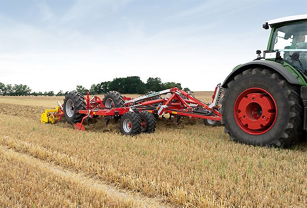 Mit Arbeitsbreiten von 4,0 bis 6,0 Metern sowie in 3- und 4-balkiger Ausführung (Terria 4030, 5030, 6030 und Terria 4040, 5040, 6040) ermögliche diese Maschine laut Pöttinger ein breites Anwendungsspektrum in der Bodenbearbeitung. Der Käufer hat die Wahl – vom flachen Stoppelsturz bis hin zur krumentiefen Lockerung.