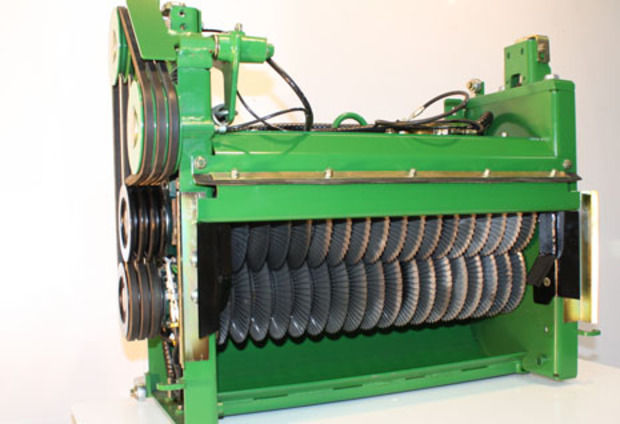 Im Gegensatz zu Aufbereitungssystemen der gleichen Bauart, die mit geraden Scheiben arbeiteten, setze der neue KernelStar auf eine patentierte neue Technik. Dabei werde das Erntegut von den ineinandergreifenden, konvex geformten Scheiben der unteren Rolle und den konkaven Scheiben der oberen Rolle aufbereitet. Die spezielle Form sorge trotz identischer Scheibendrehzahl für Geschwindigkeitsdifferenzen von bis zu 50 Prozent.