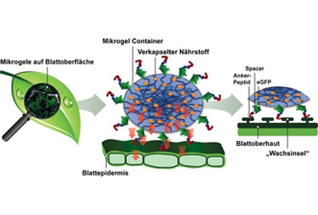 Die Oberfläche der Gelpartikel sei mit Ankerpeptiden aus Milchsäurebakterien bestückt, die fest an der Blattoberfläche hafteten und so ein Auswaschen verhinderten, berichteten die Wissenschaftler vom DWI-Leibniz-Institut für Interaktive Materialien in Aachen, der Rheinisch-Westfälischen Technischen Hochschule (RWTH) Aachen und der Universität Bonn.