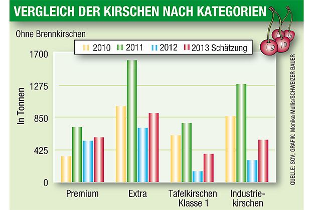 Die Ernteschätzungen differieren aber stark. Bei den Tafelkirschen geht der Obstverband von einer durchschnittlichen bis guten Kirschenernte aus. Rund 1875 Tonnen sollen in den Handel kommen, dies entspricht in etwa der Menge von 2010. Die Klassen Extra und Premium halten einen Anteil von rund 80 Prozent an der gesamten Tafelkirschenernte. Das Wetter hat diesen Kirschen also nicht so sehr zugesetzt.