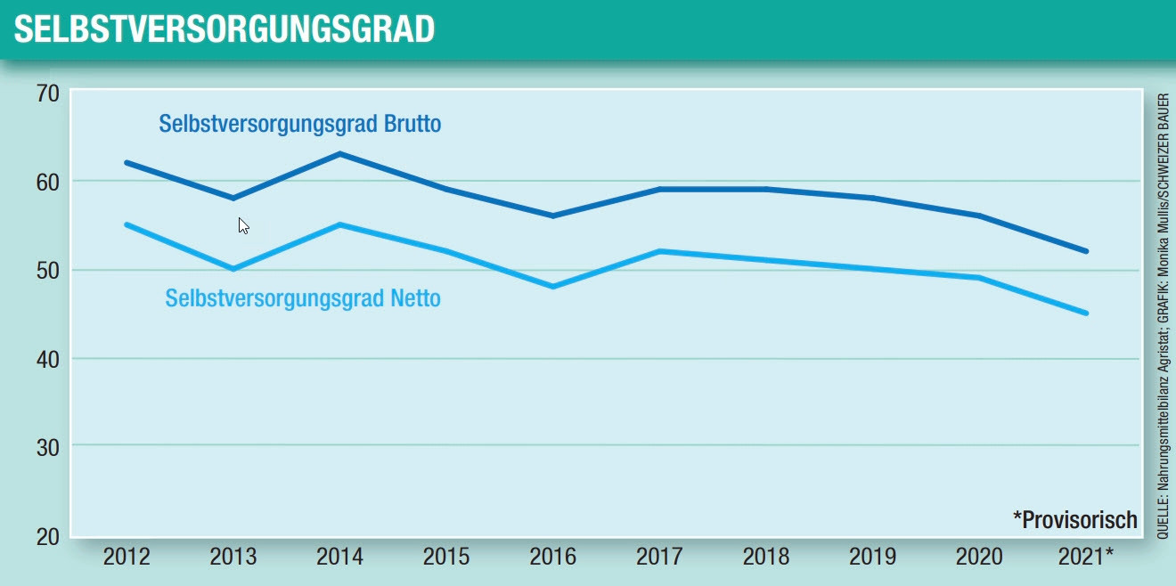 Der provisorische Netto-Selbstversorgungsgrad lag im Jahr 2021 bei 45%, im Jahr 2012 noch bei 55%. Der provisorische Brutto-Selbstversorgungsgrad lag 2021 bei 52%, im Jahr 2012 bei 62%. Beim Netto-Selbstversorgungsgrad wird berücksichtigt, dass ein Teil der tierischen Inlandproduktion auf importierten Futtermitteln beruht. Dazu wird bei der Berechnung des Netto-Selbstversorgungsgrades die Inlandproduktion um jenen Anteil reduziert, der mit importierten Futtermitteln produziert wird.
