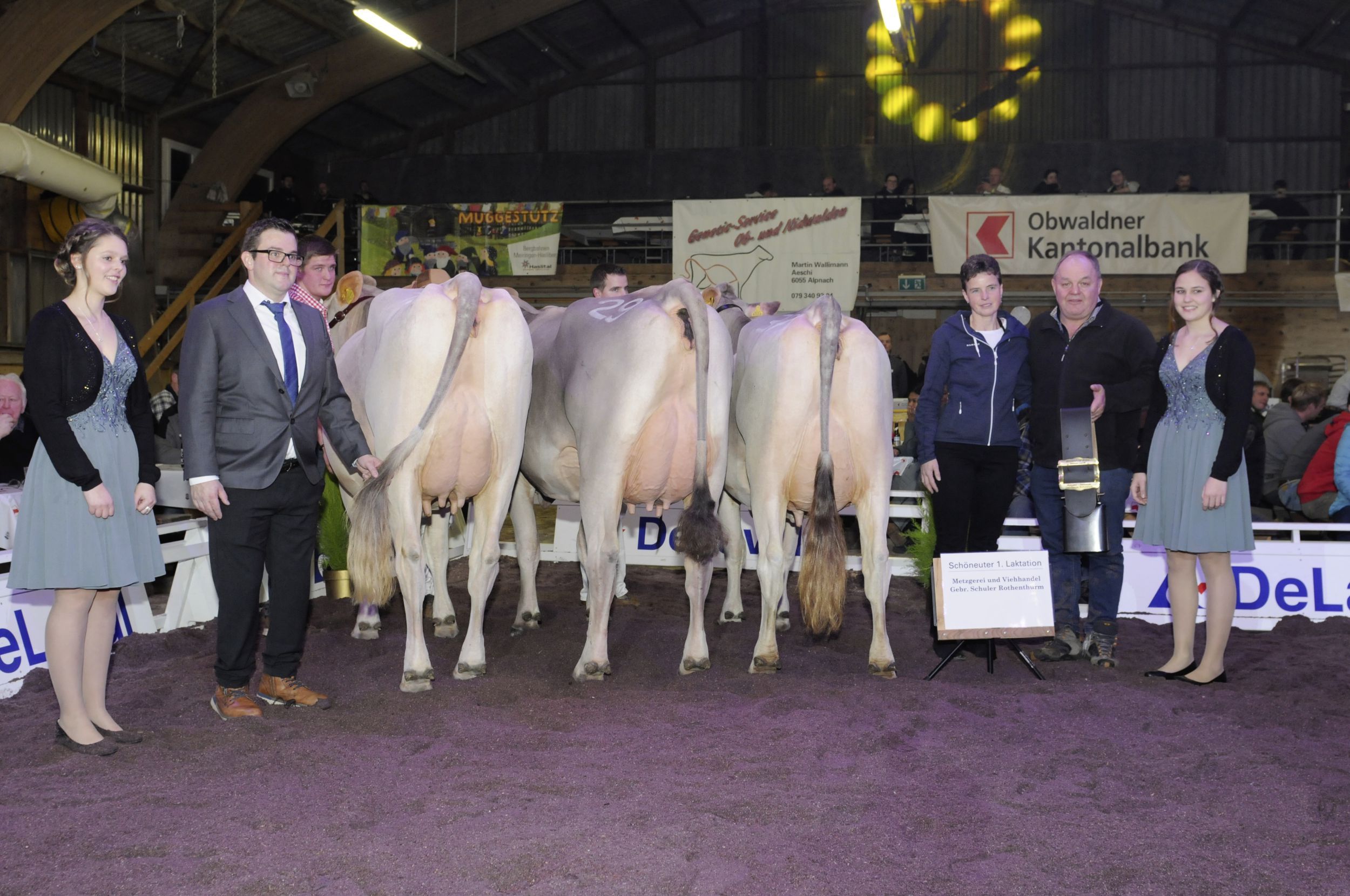 Bei den Erstmelkkühen ging als klare Siegerin Bruenigtrail Passat Guyana von OK-Präsident Urs Albert, Alpnachstad hervor. Die ausgeglichene mit viel Kapazität ausgestattete Guyana gewann auch den Miss Genetik-Titel. Junior Reserve-Champion wurde Boesch’s BS Glenwood Elena von André Imfeld, Alpnach Dorf vor M & M’s Glenwood Katanga aus dem Stall von Franz Durrer, Kerns. Schöneutersiegerin der Erstmelkkühe wurde Pete Pepina von Martin Wallimann. Boesch’s BS Glenwood Elena wurde hier Zweite vor Jaguar Kira von Adrian Waser.