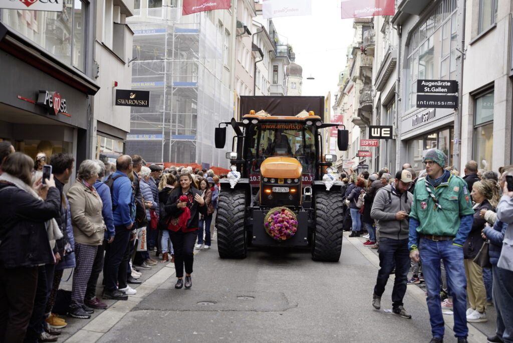 Das traditionelle Gericht war im Verlauf der Woche in Jenaz im Prättigau vorproduziert worden. Auf einem Traktor über Land- und Nebenstrassen wurde der Capuns am Samstag in der Früh in rund drei Stunden aus dem Prättigau nach St. Gallen gefahren, wie der Kanton Graubünden mitteilte.