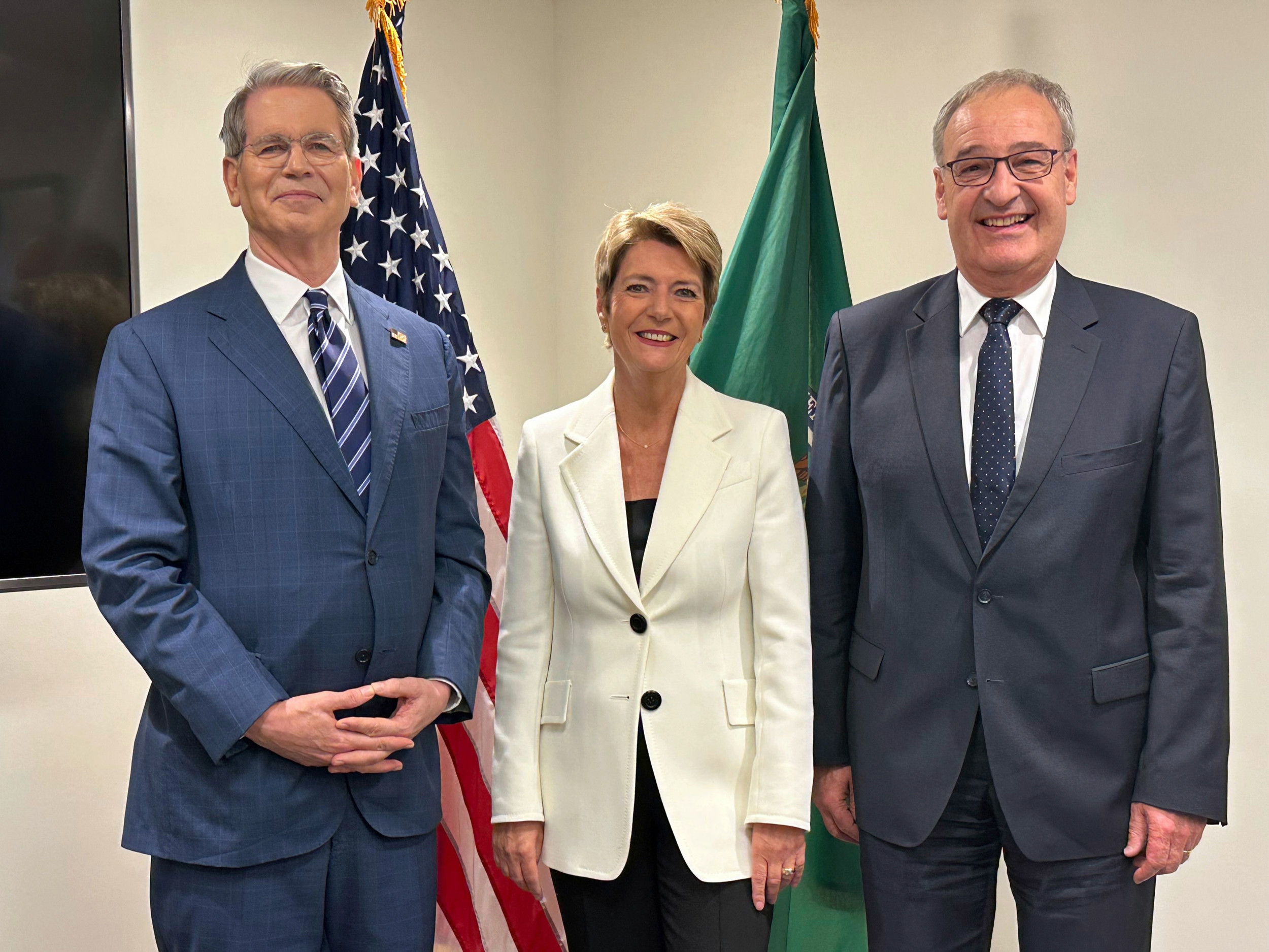 US-Finanzminister Scott Bessent (v.l.), Bundespräsidentin Karin Keller-Sutter und Wirtschaftsminister Guy Parmelin haben sich in Genf getroffen. (Archivbild)