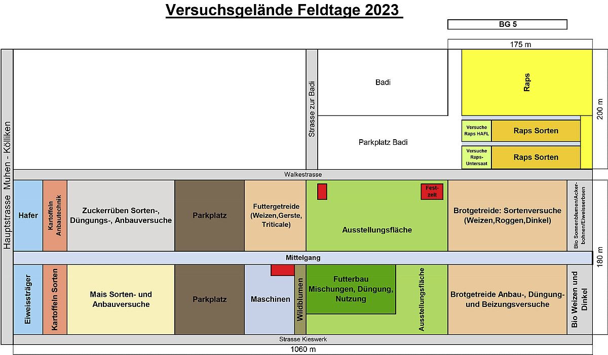 Auf rund 16 Hektaren gibt es Praxisversuche mit neuen Sorten und Anbautechniken bei Kulturen wie Kartoffeln, Mais, Zuckerrüben, Raps, Futterbau, Brot- und Futtergetreide zu begutachten. Zudem gibt es täglich Führungen zu immer stärker nachgefragten Kulturen wie Speisehafer oder Eiweissträger. Auf der Wildblumen-Versuchsfläche werden praxistaugliche Möglichkeiten zur Förderung der Biodiversität gezeigt.