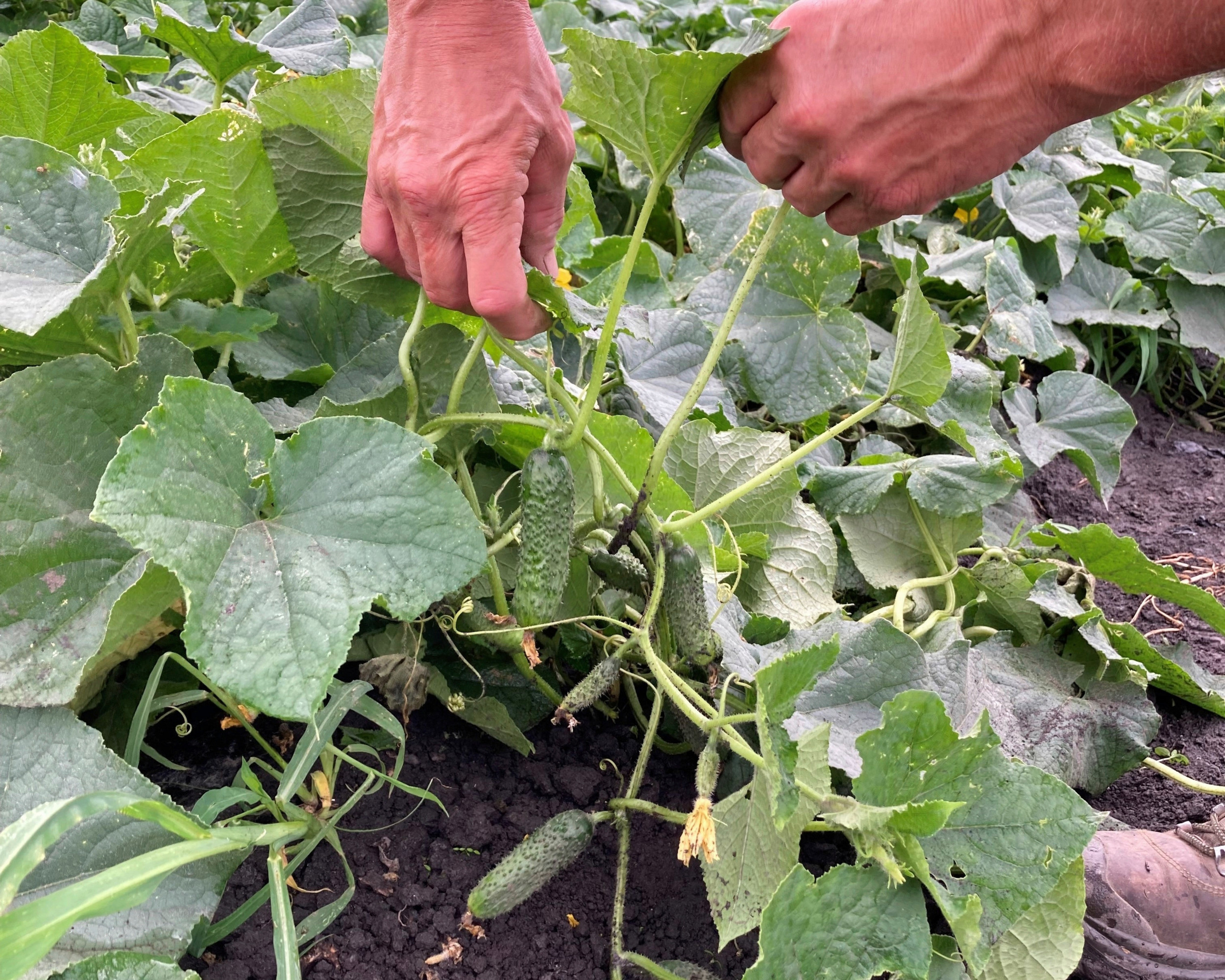 Die Gurkenernte wird durch die vielen Blätter und Triebe zusätzlich erschwert.